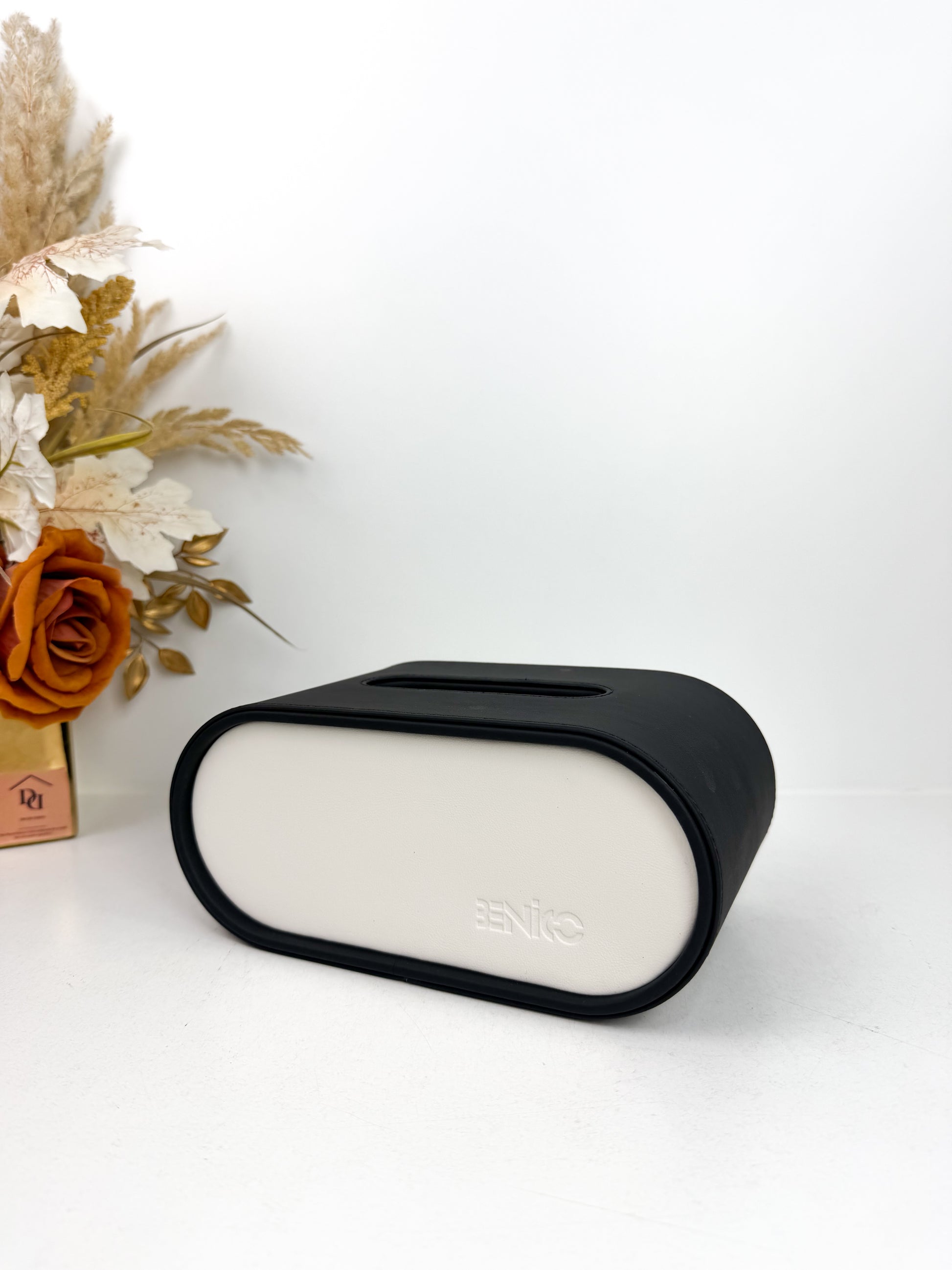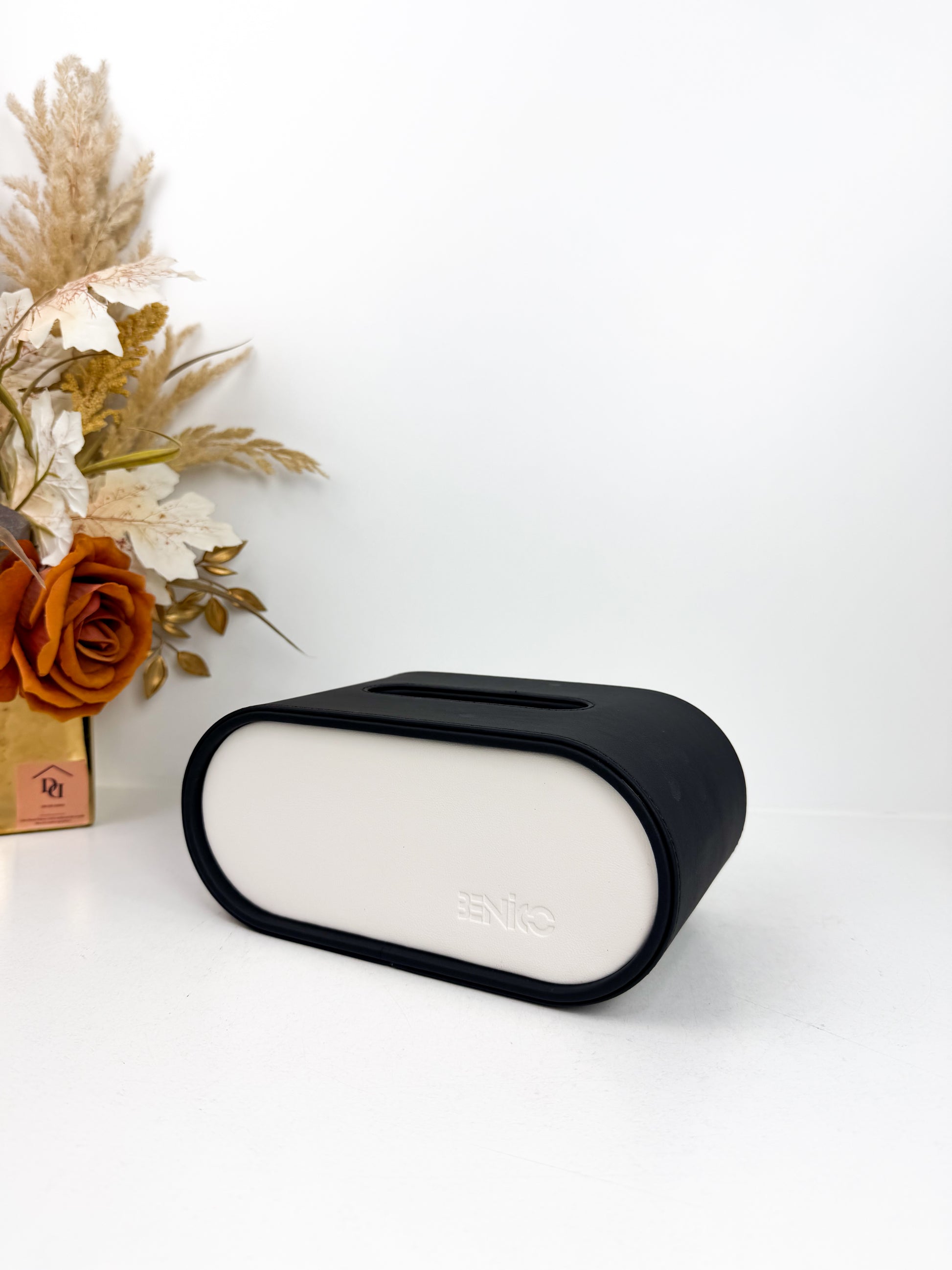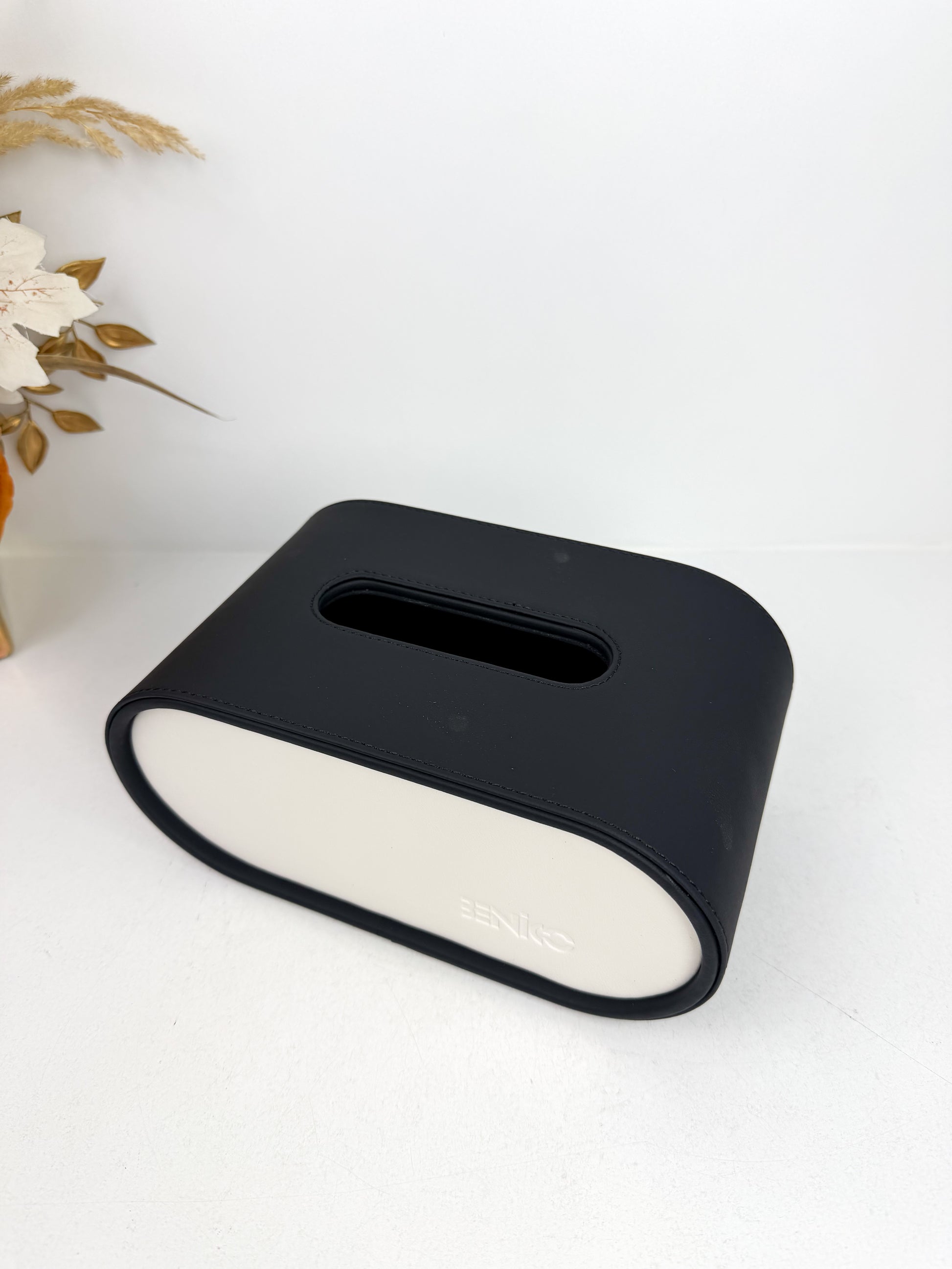 - Découvrez cette boîte à mouchoirs au design contemporain, confectionnée en cuire de qualité avec une structure noire intemporelle, la bordure blanche arrondie ajoute une finition délicate et raffinée qui complète parfaitement votre décoration intérieure