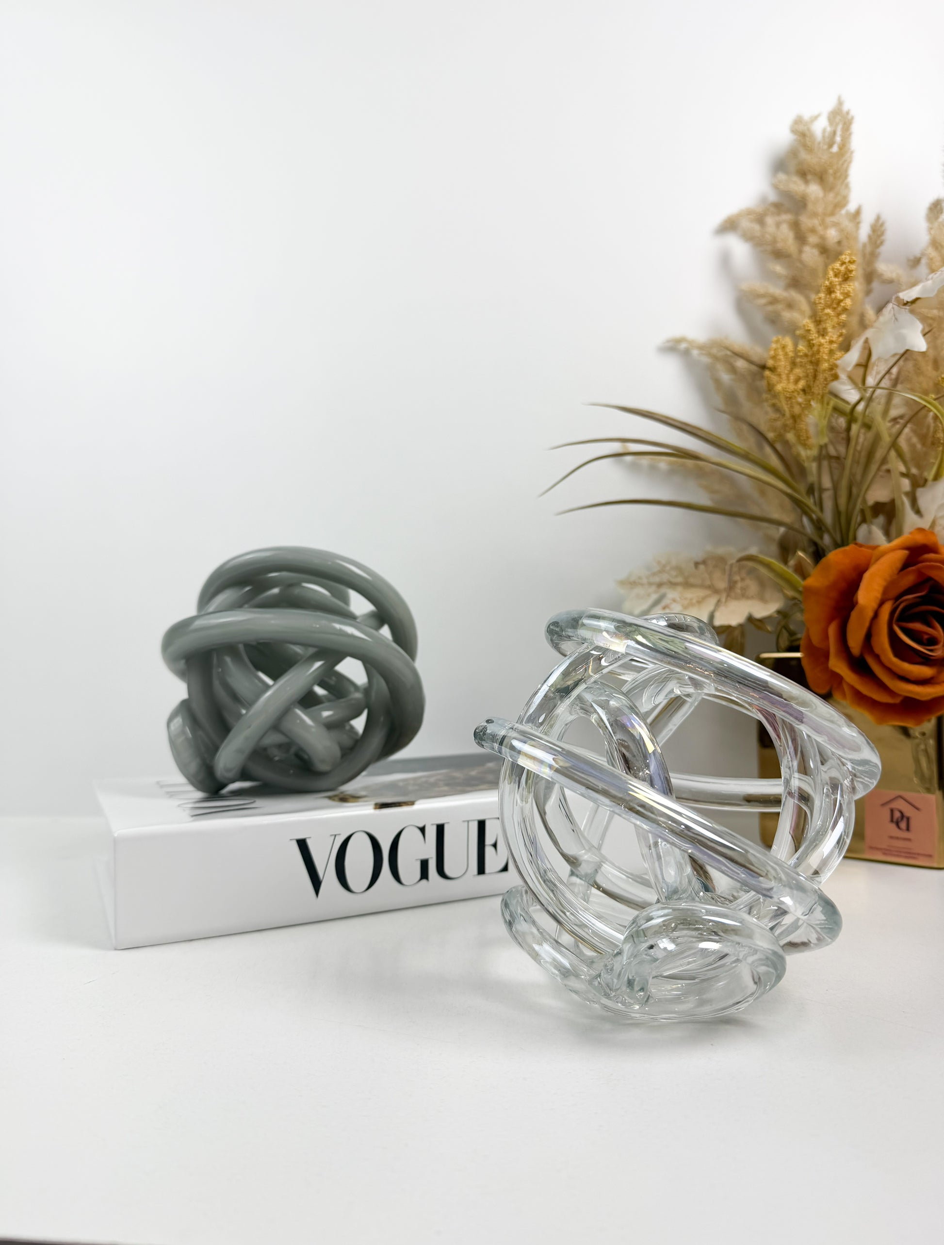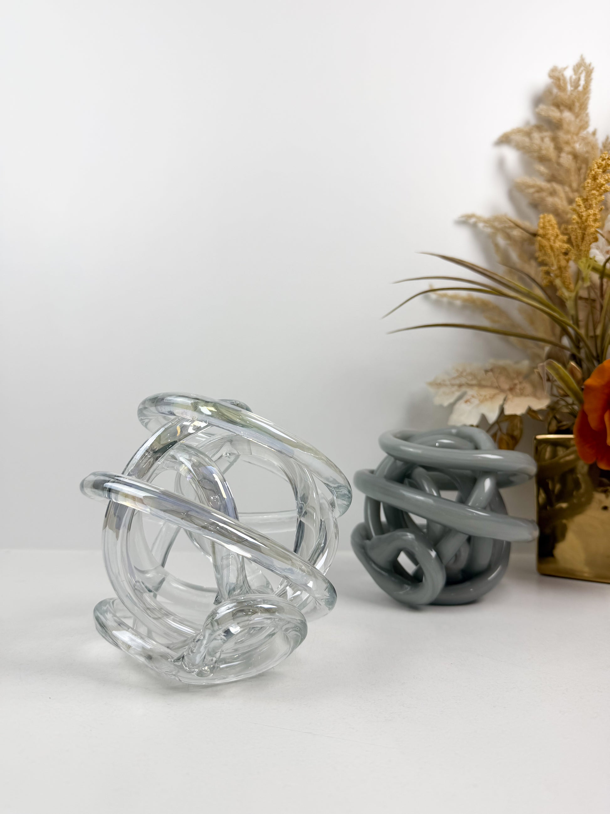 • Les sculptures présentent un design abstrait et moderne en forme de nœud infini, réalisé à la main par soufflage de verre selon des techniques artisanales.