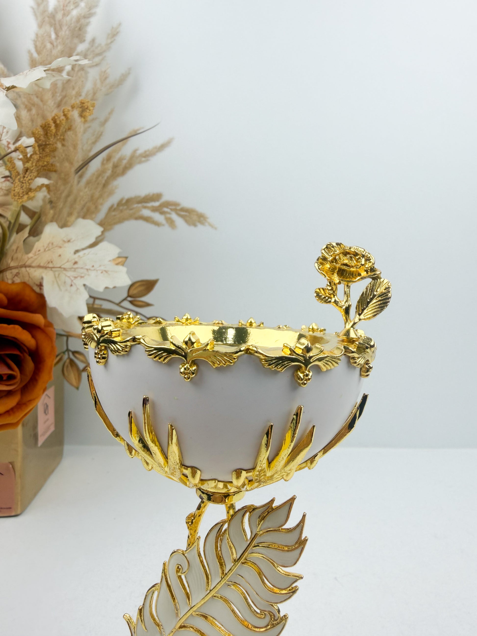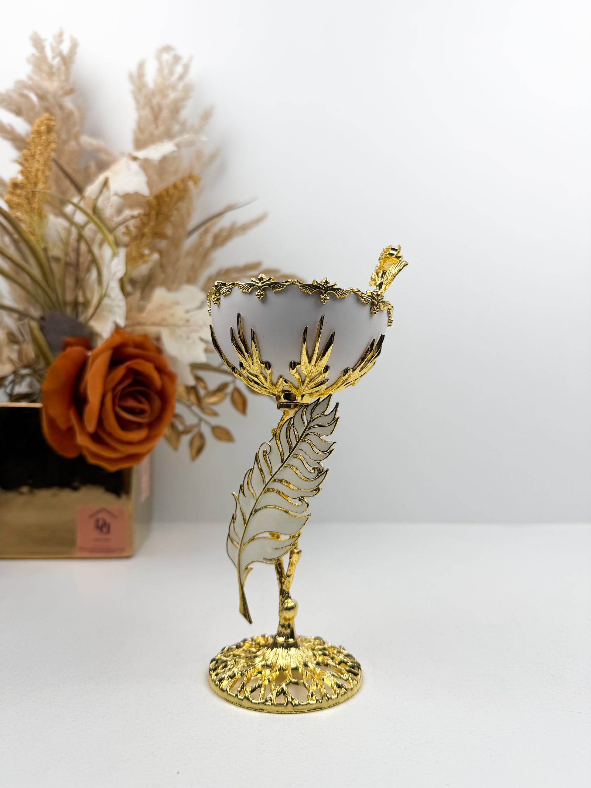 Encensoir de luxe blanc et dorée avec des détails de plume