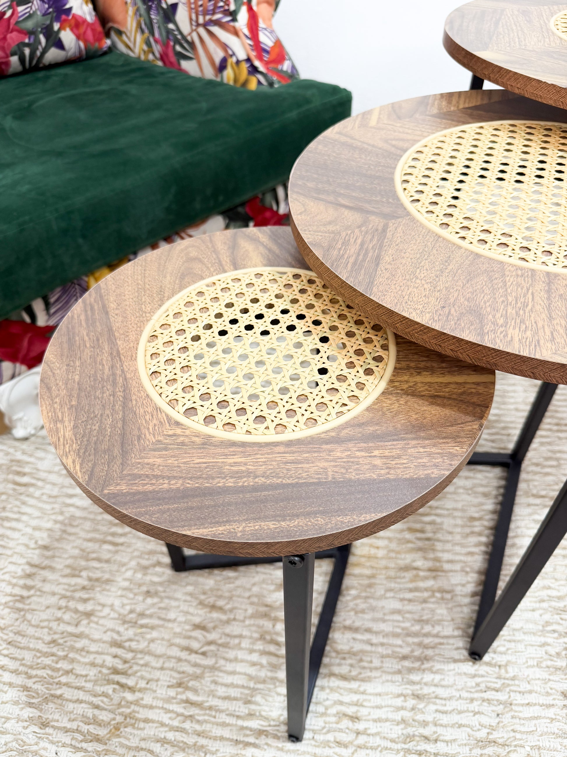 Ensemble de 3 tables gigognes rondes avec incrustations de rotin et structure élégante en métal