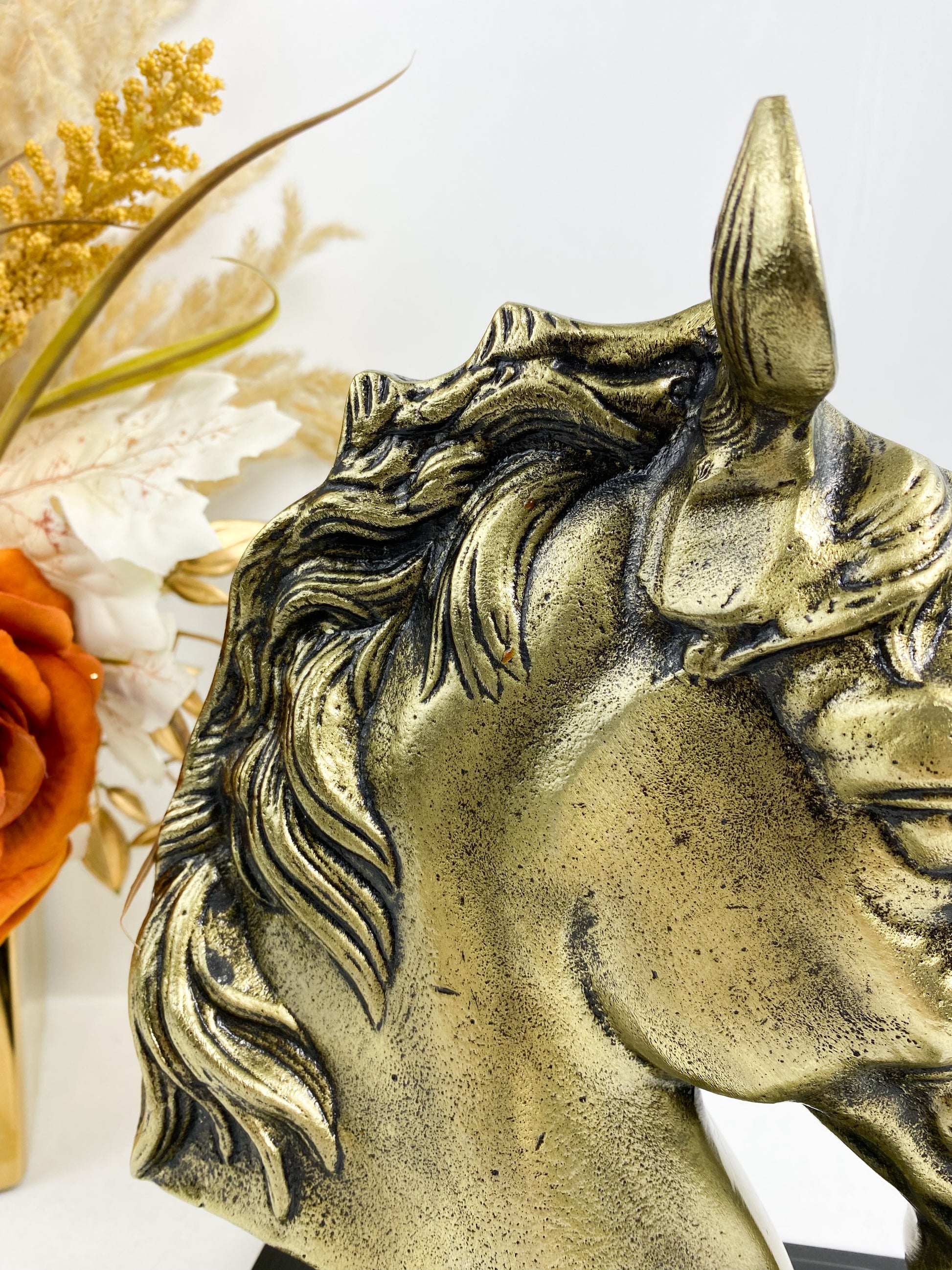 - Cette sculpture majestueuse présente une tête de cheval, finie à la main en laiton antique. L'ensemble est en aluminium et repose sur un socle noir sobre. Le contraste des couleurs captive le regard et fait de cette sculpture une pièce unique pour décorer votre intérieur.