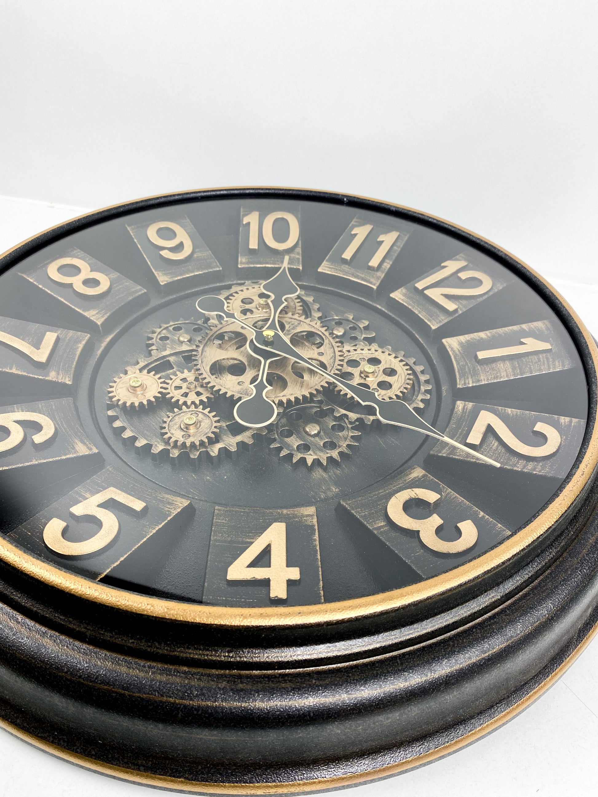 - Ajoutez une touche d’originalité et de caractère à votre intérieur avec cette grande horloge murale industrielle au design unique et aux engrenages mobiles décoratifs. Alliant style rétro et mécanique moderne, cette horloge de 40 cm de diamètre est parfaite pour sublimer un salon, une cuisine, ou même un bureau.
