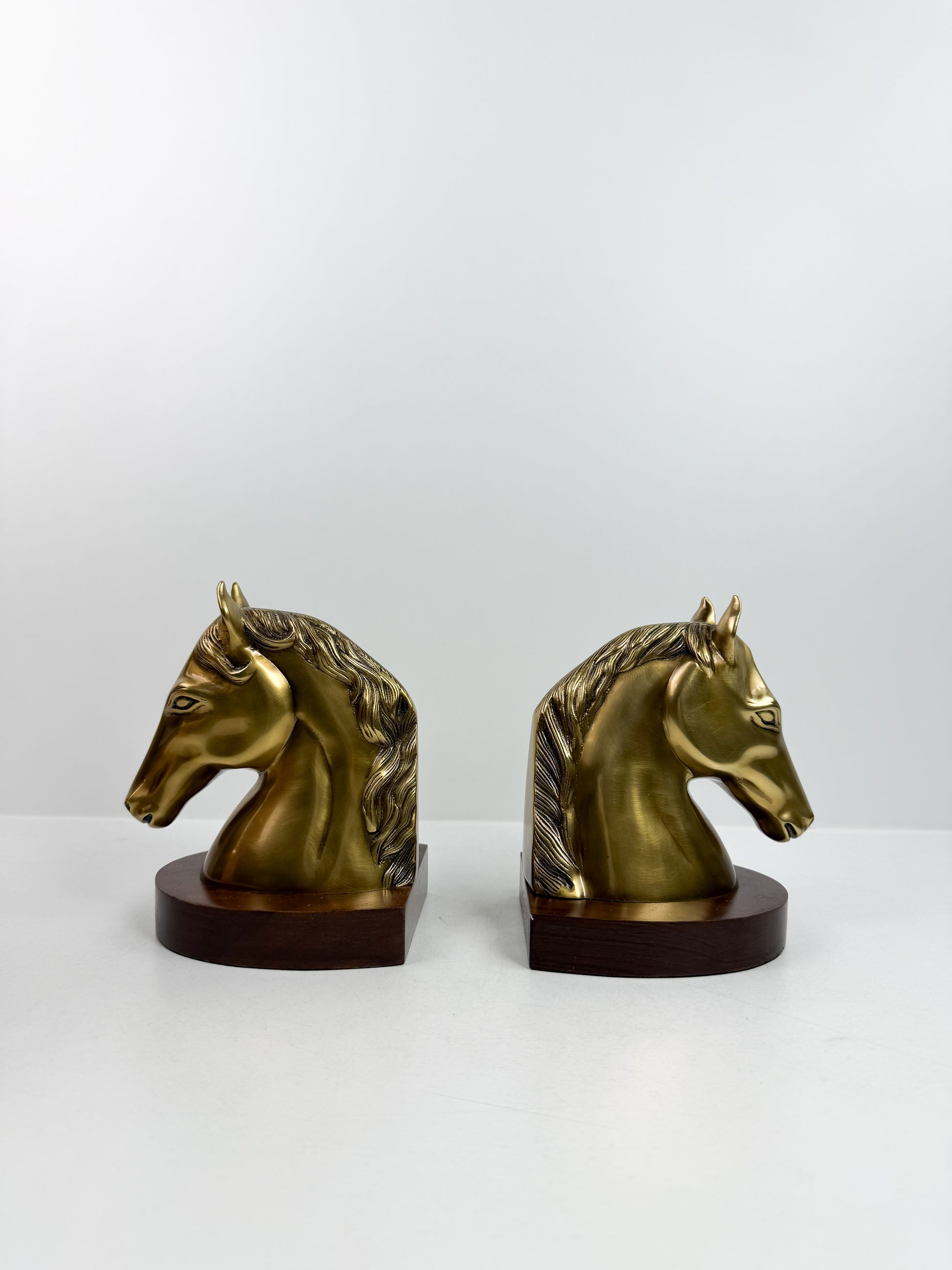 Paire de serre-livres en forme de tête de cheval en cuivre.