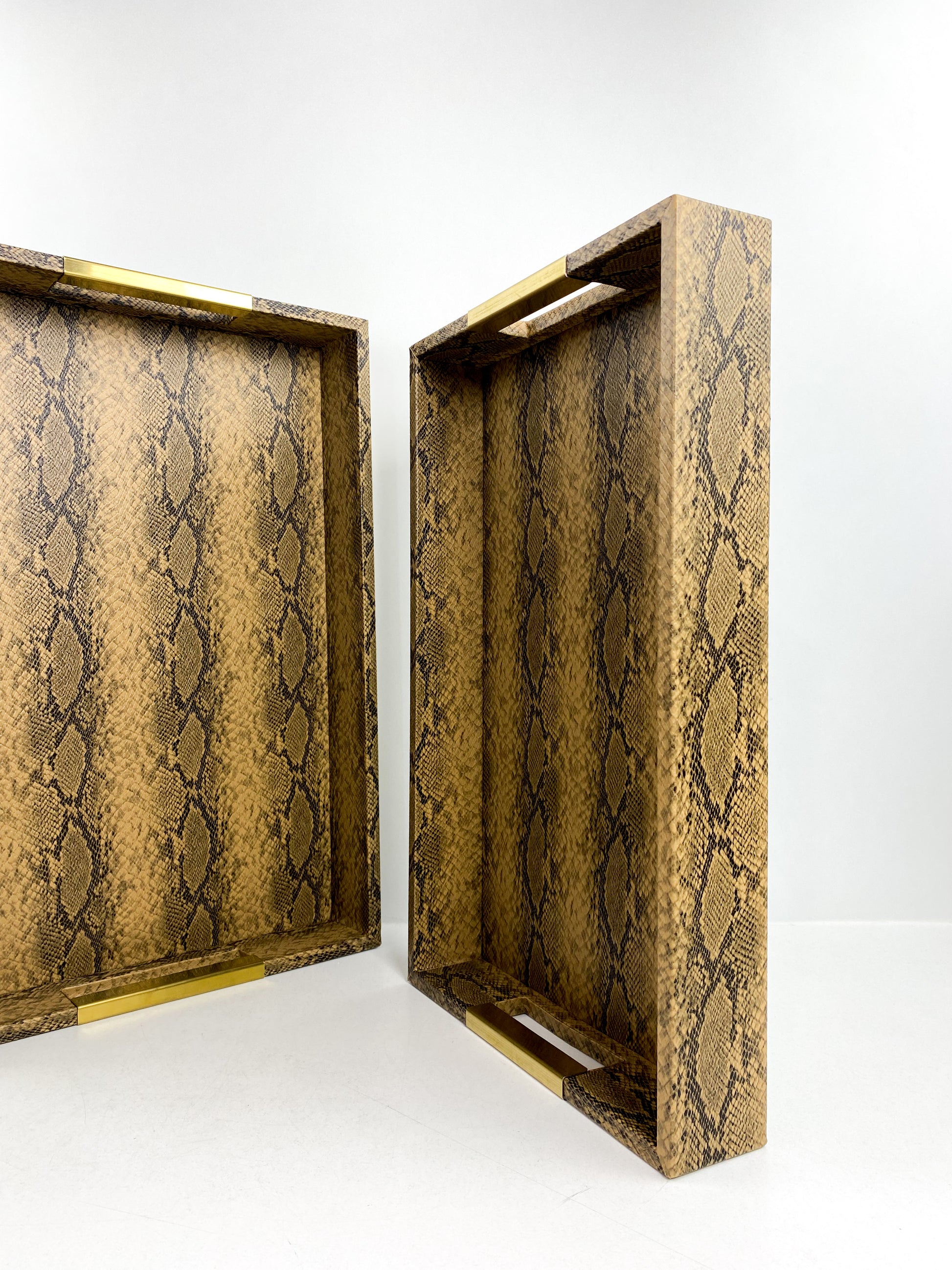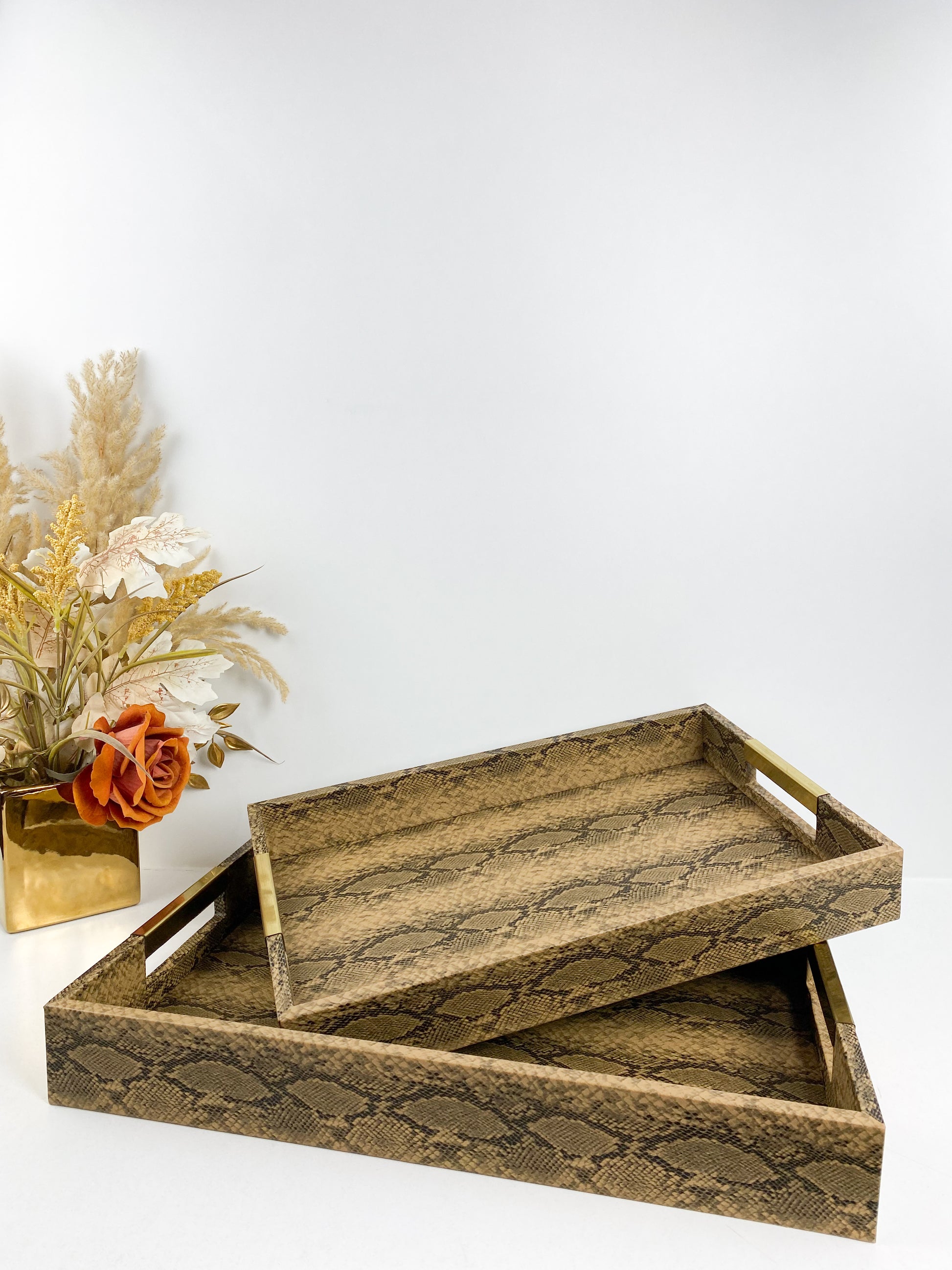 Lot de 2 plateaux gigognes décoratifs de style luxueux moderne en imitation peau de serpent doré en acier inoxydable