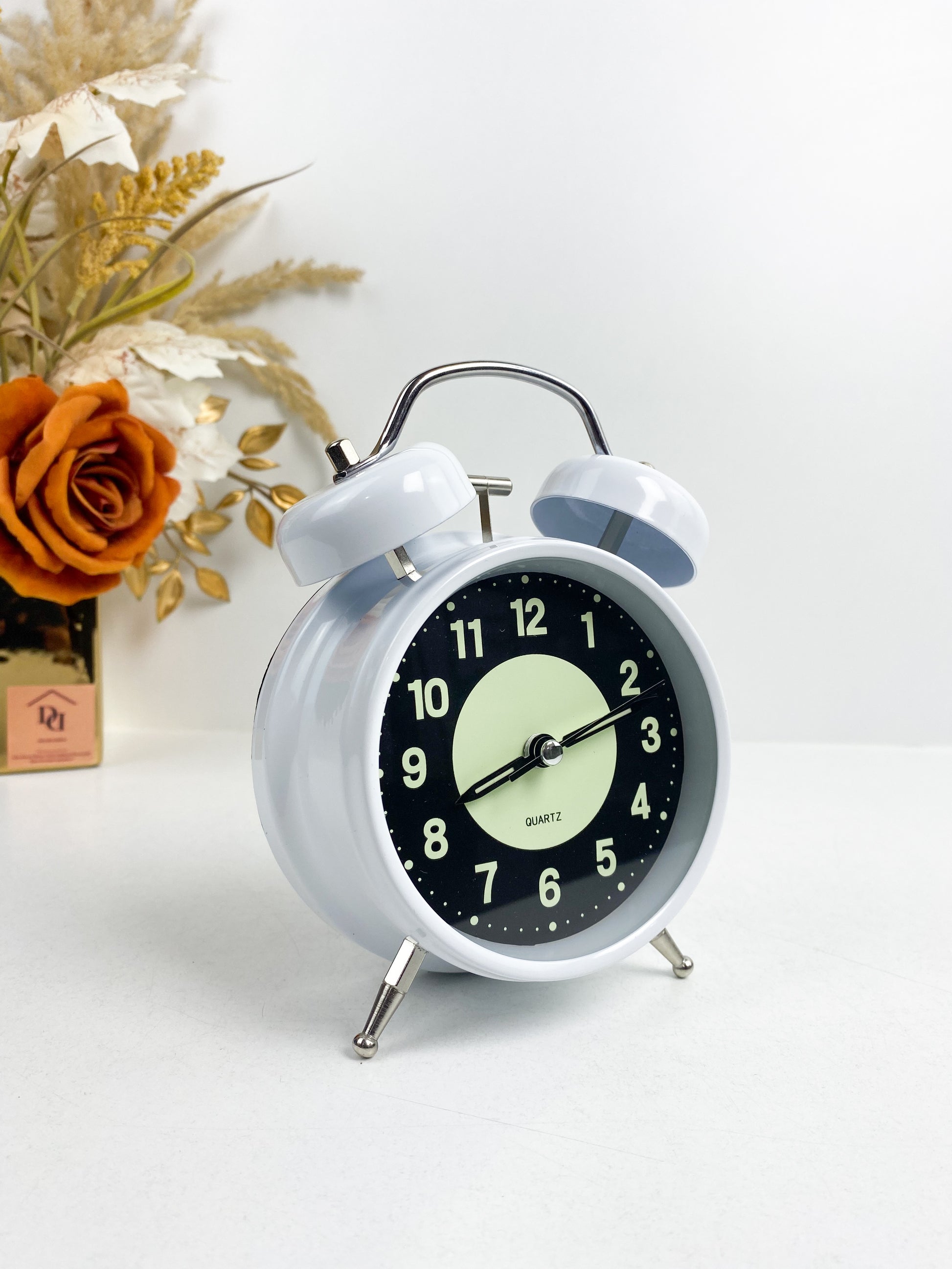 - Ce réveil double cloche en métal blanc combine robustesse et charme rétro pour réveiller vos journées avec énergie. Sa sonnerie puissante vous sortira du lit sans difficulté, tandis que sa veilleuse intégrée vous guide doucement dans la pénombre. Pratique et stylé, il apporte une touche de fun à votre routine matinale !