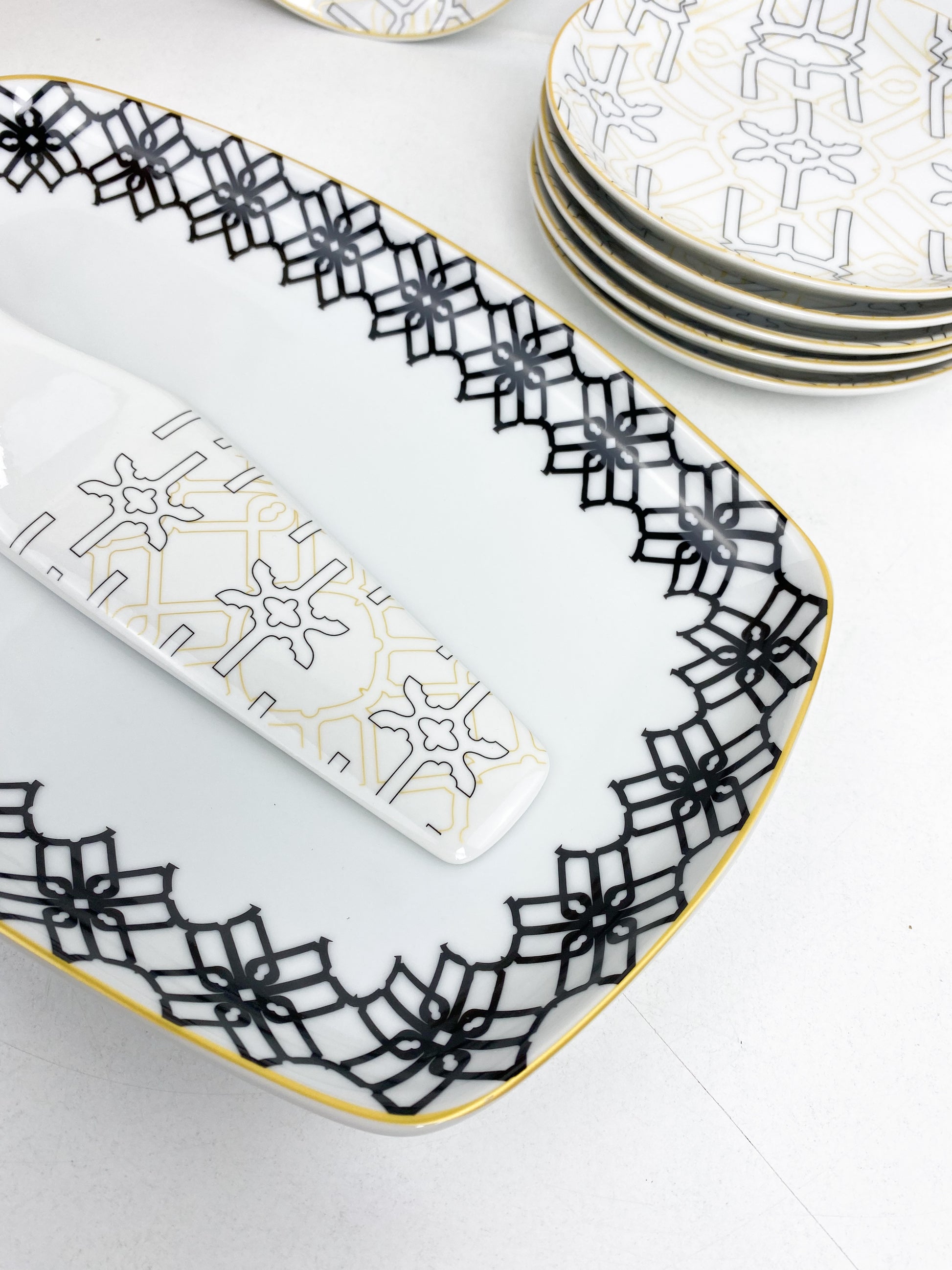 Set de 8 pièces a gâteaux en porcelaine noir et or -motif géométrique