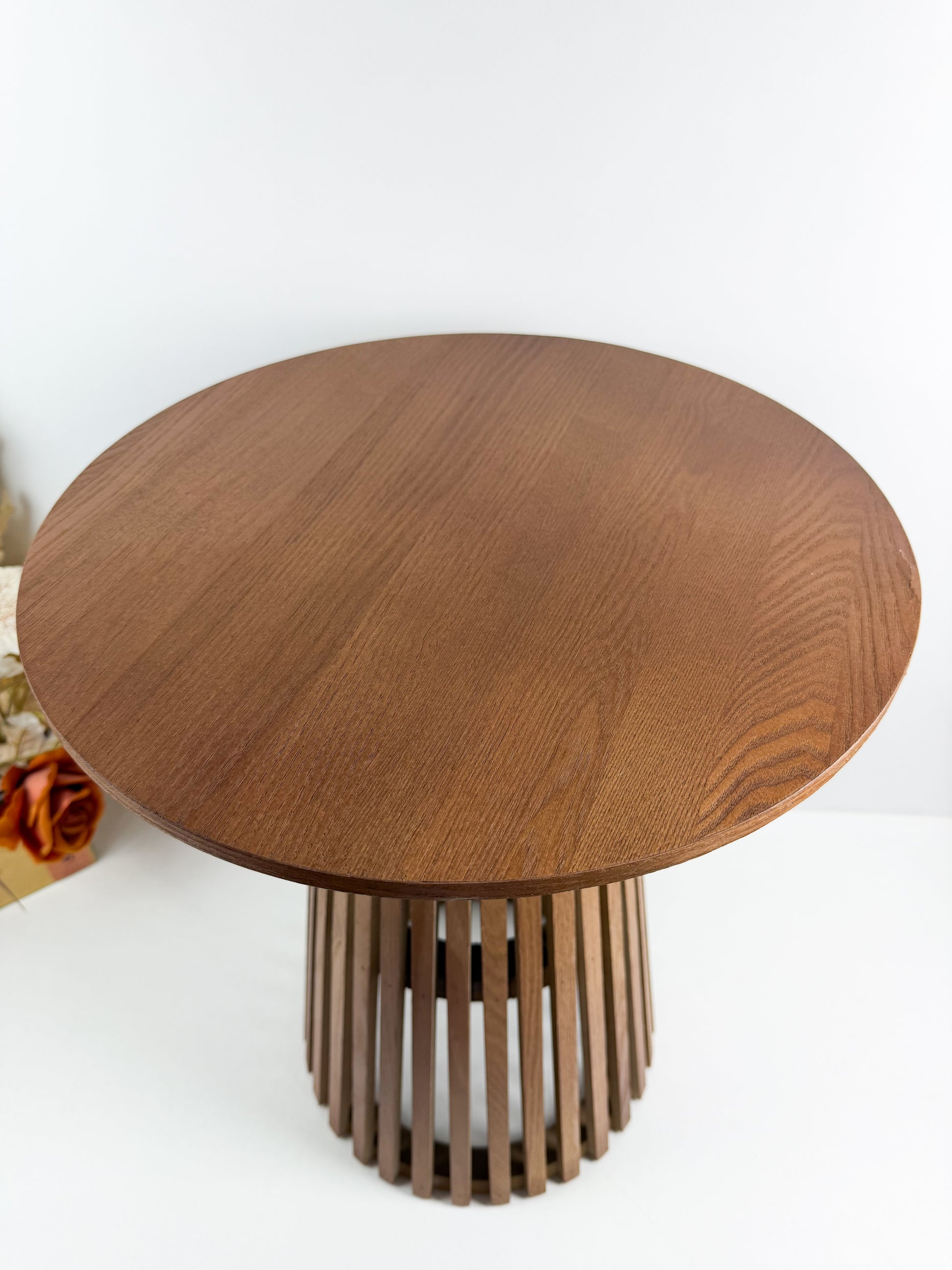 - Caractéristiques : Forme ronde avec un piètement unique fait de lattes verticales, conférant un style ethnique chic ou industriel